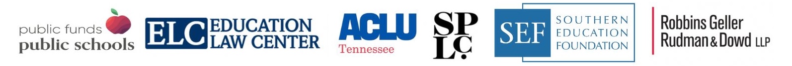 The plaintiffs are represented by Education Law Center and the Southern Poverty Law Center, which collaborate on the Public Funds Public Schools campaign, the American Civil Liberties Union of Tennessee, as well as the Southern Education Foundation, and pro bono by the law firm Robbins Geller Rudman & Dowd LLP.
